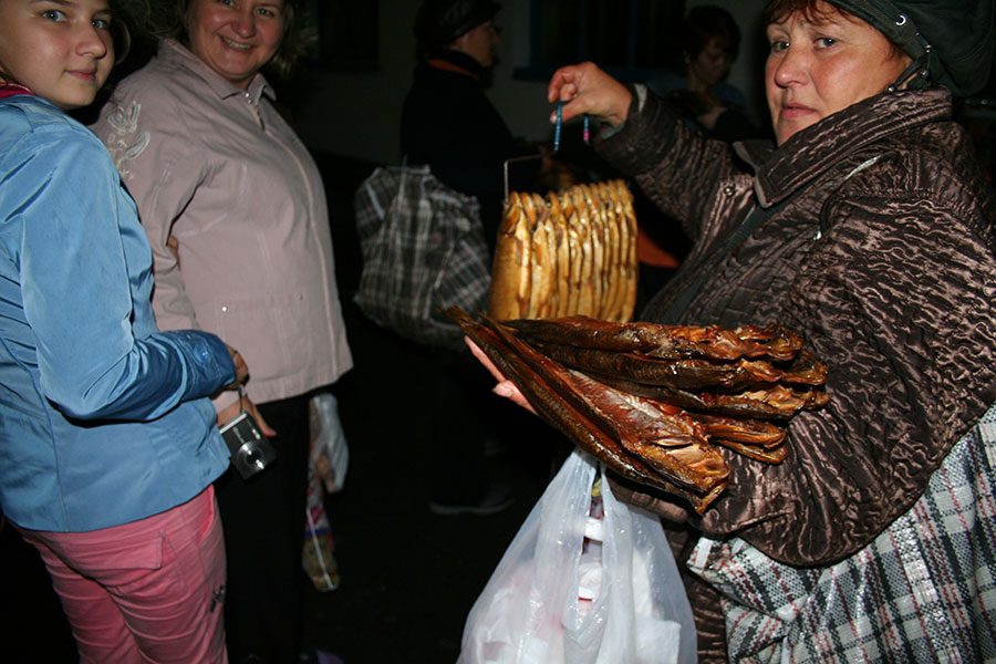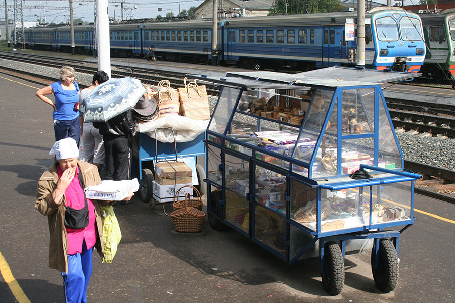 Het is aan te raden om iets als noodles of soep achter de hand te hebben, maar tijdens de stops is er ook op de stations voldoende te krijgen. Op ieder perron wemelt het van de Babushka’s. Deze, over het algemene oudere, vrouwen proberen etenswaren als vis, groente en brood aan de man te brengen. Geen reden dus om zonder eten te komen zitten.